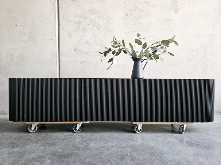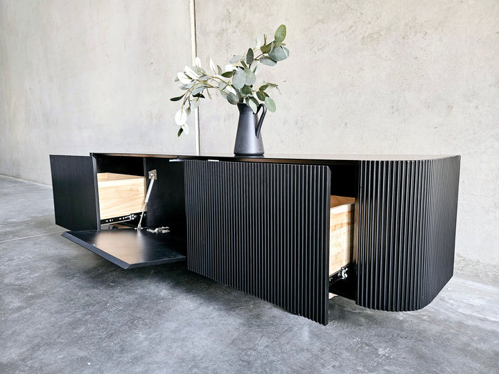 Transform your entertainment area with our curved edge, wall-mounted TV unit.  This modern design offers a clean, minimalist aesthetic, maximizing floor space while the striking curved edge adds a touch of warmth and sophistication.