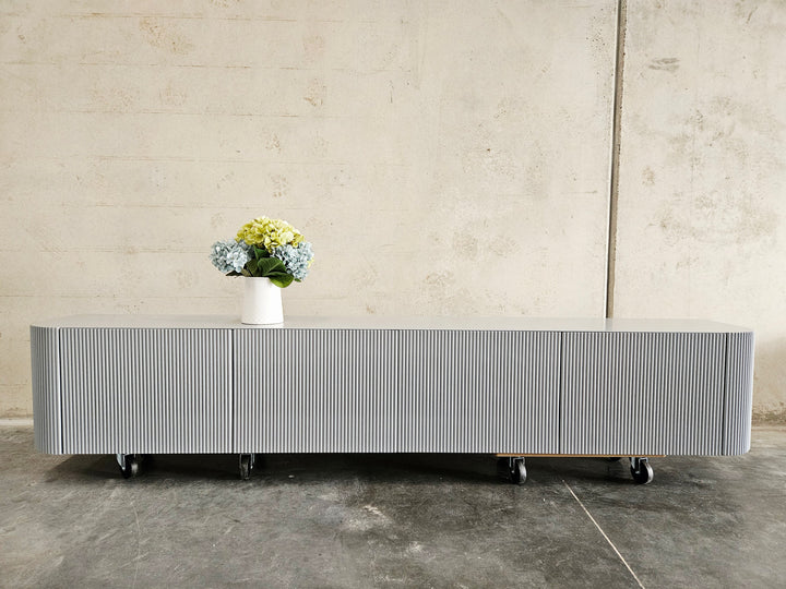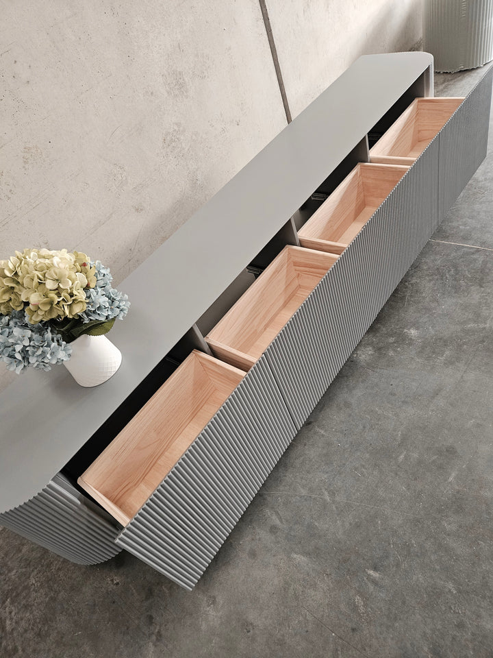 Transform your entertainment area with our curved edge, wall-mounted TV unit. This modern design offers a clean, minimalist aesthetic, maximizing floor space while the striking curved edge adds a touch of warmth and sophistication.
